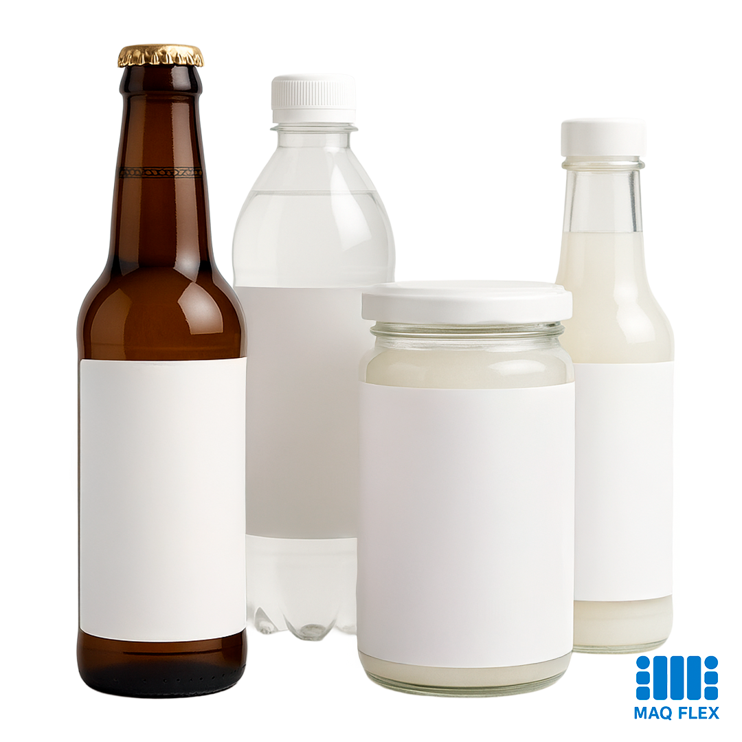 Etiquetas adesivas aplicadas diretamente em garrafas, frascos e potes. Usadas em bebidas (refrigerantes, cervejas artesanais), molhos, conservas etc., geralmente em papel couchê ou filmes como PP.