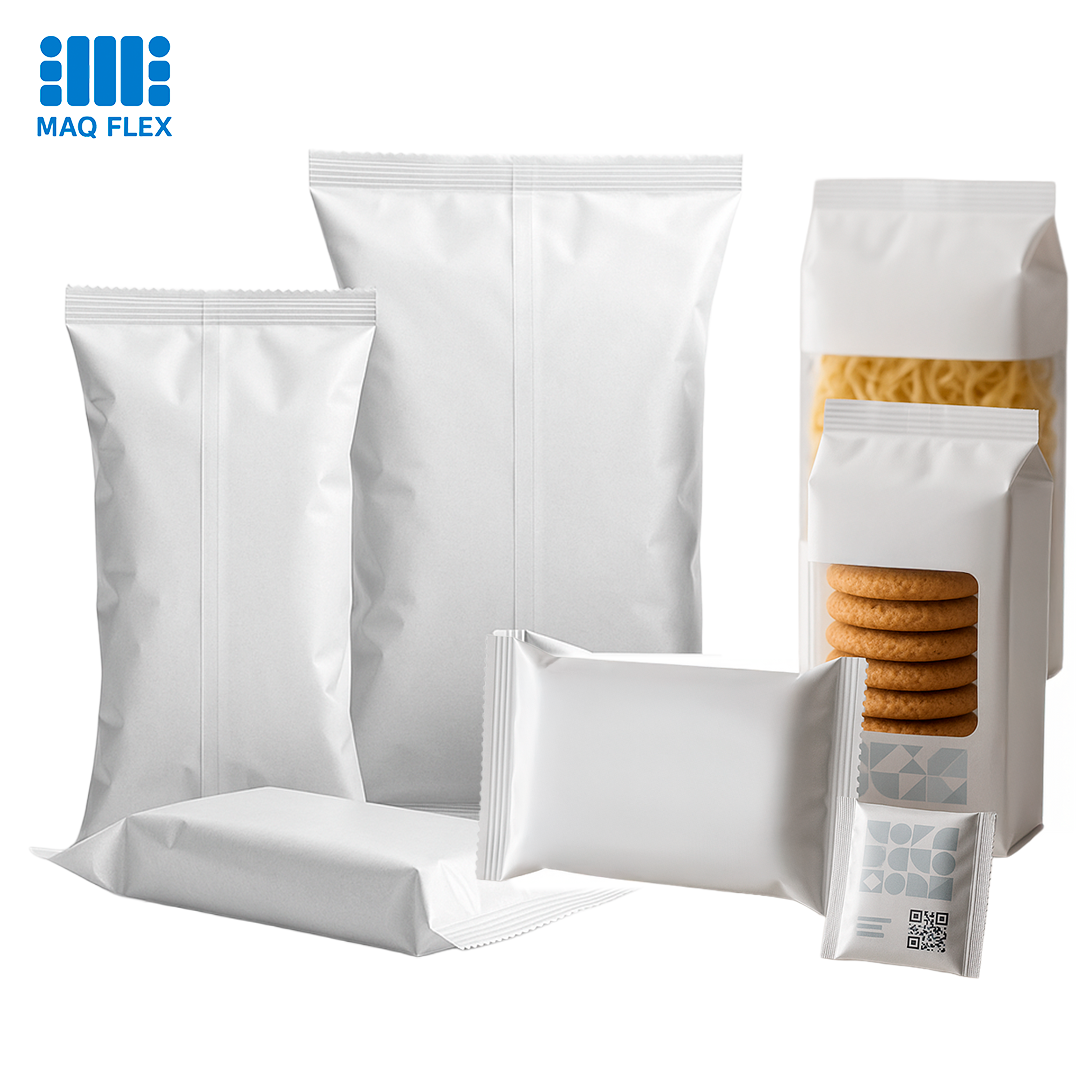 Embalagens plásticas maleáveis usadas em snacks, biscoitos, massas, doces e congelados. Incluem flow packs (sachês ou pacotes selados horizontalmente) de BOPP ou PET.
