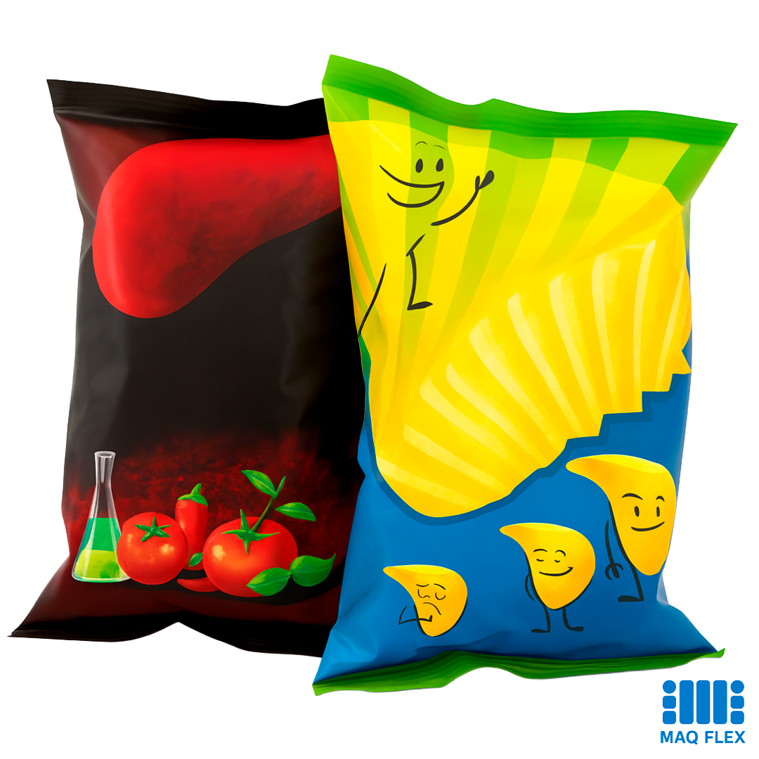 Estruturas multicamadas comuns em alimentos de maior shelf-life. Exemplos: snacks, sachês de molho, pó de café, pet food e stand-up pouches. Combinam filmes (BOPP, PET, nylon) com barreiras como alumínio ou vernizes especiais. São impressas geralmente pelo lado interno (verso) e laminadas para proteger a impressão e atender às exigências de contato com alimentos.