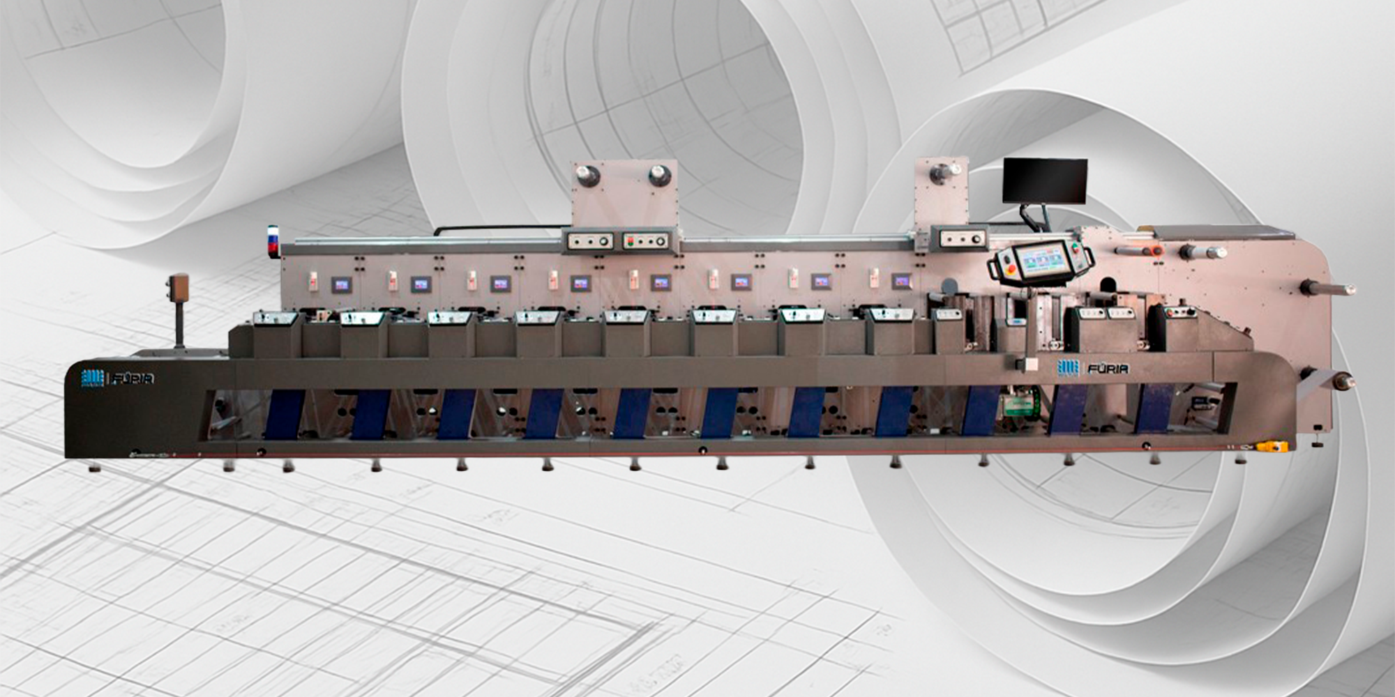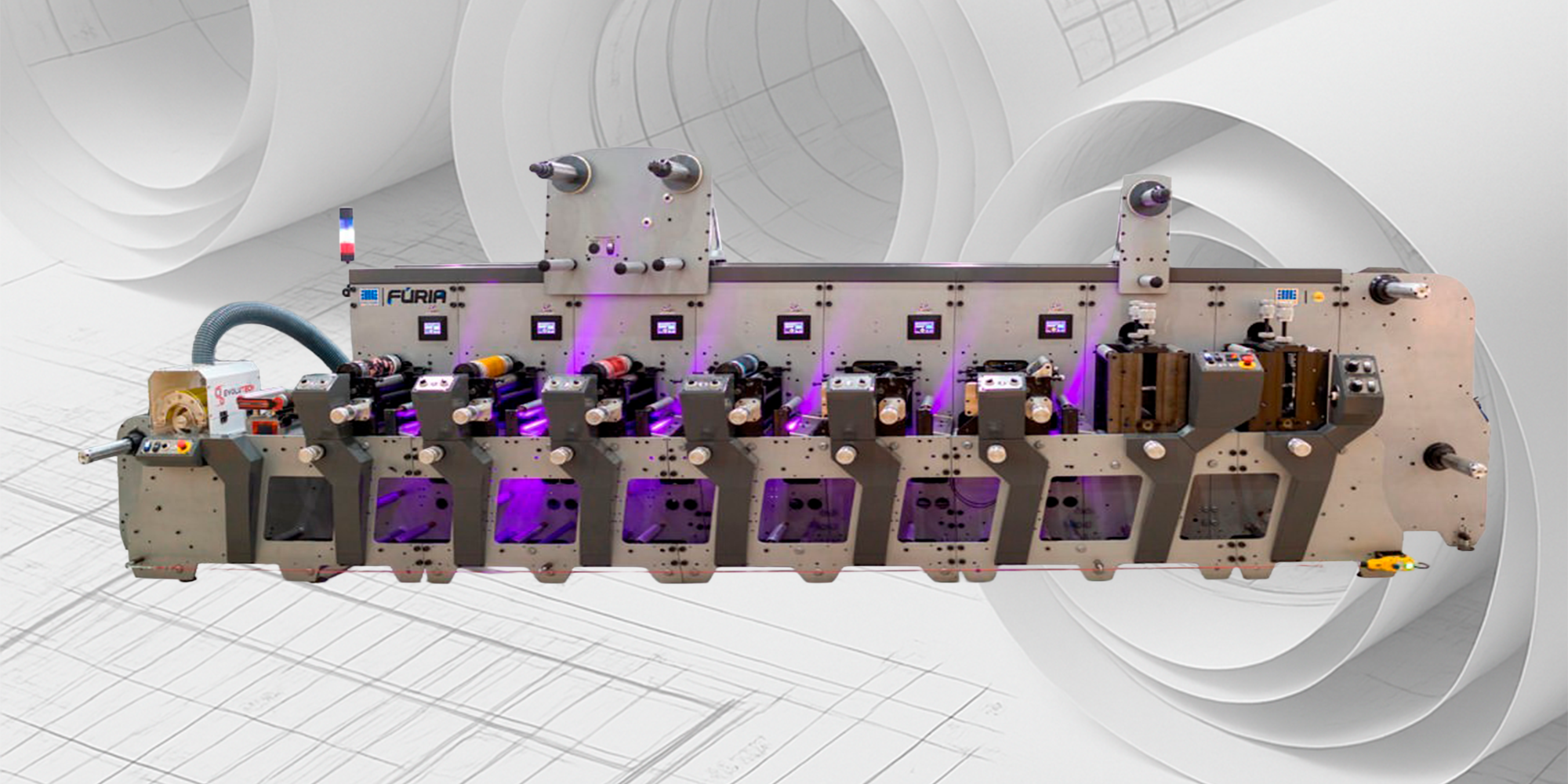A FÚRIA sustenta velocidade mecânica típica de até 120–150 m/min (conforme configuração). A velocidade de produção varia conforme substrato, família de tinta (UV/UV LED, água ou solvente), perfil de secagem/cura, linhagem/volumetria do anilox e acabamentos inline (corte, laminação, etc.).